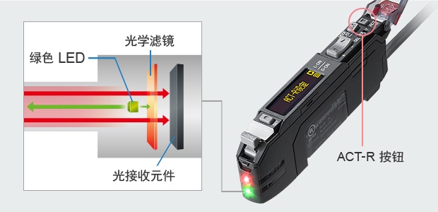 传感器的ON/OFF 与光纤的指示灯联动,能根据传感器的状态发出绿光,状态的可视化成为可能。