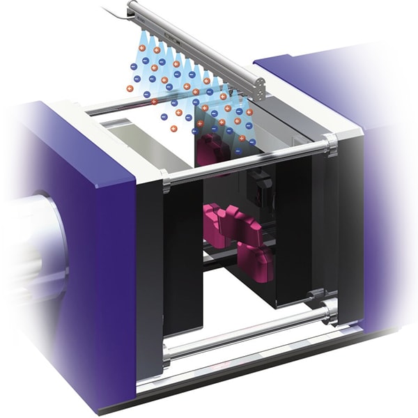 射出成型时可能会导致大量带电。如因静电造成异物不良,将会废弃该产品。有时模制品没有从模具中分离出来,需要人工手动移除,从而导致成品率下降。可使用静电消除器防止异物附着,同时防止模具残留。