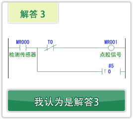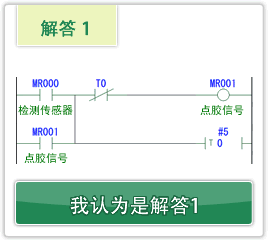 具有检测工件后在一定期间内阀门输出置于ON,并涂抹溶剂的装置。请从解答1至解答3中, 选择适当的梯形图,作为传感器置于ON后处于ON状态,经过0.5秒后置于OFF的程序。