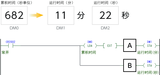 执行上述梯形图程序后,会将除法的商存储为运行时间(分),余数存储为运行时间(秒)。