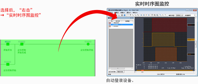 确认通过KV STUDIO创建的程序时序图时,应选择包含希望进行监控设备的程序, 且使用"实时时序图监控"的方法较为便捷。